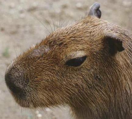 Bien qu'il ressemble à un énorme cochon dinde avec ses yeux doux, son museau aplati et ses petites oreilles, si on regarde le reste de son corps, sa peau épaisse, son ventre rond et ses jambes de devant plus longues que celles de derrière, il ressemble plutôt a un hippopotame couvert d'une fine fourrure rousse. Avant la saison des pluies, femelle et male s 'accouplent. Après 4 mois, les 2 à 8 petits sont nés. Après deux mois, les petits sont capables de se nourrir tous seuls mais ils resteront pendant les 17 mois qui suivent avec leur mère. Il rejoindront ensuite le troupeau et vivront de huit à dix ans. Le capybara est herbivore : il mange de l'écorce d'arbre, des plantes(terrestres et aquatiques), des graines, des feuilles, de l'herbe et du melon. Connu comme le plus grand rongeur, il passe sa journée à chercher de la nourriture tout en restant sur ses gardes au cas où il y aurait des prédateurs comme le jaguar et les caïmans. Mais son prédateur le plus redoutable reste l'homme qui le chasse ou l'élève. Cet animal inoffensif peut être un très mignon animal domestique. On peut aussi le trouver dans des zoos ou dans des réserves pour le protéger. Bien qu'il soit la proie de prédateurs, tels que le crocodile il n'est pas rare de le voir se prélasser à proximité d'un crocodile sur une berge ensoleillée. En effet, le crocodile ne l'attaquera jamais sur la terre ferme. Par contre, une fois dans l'eau le crocodile ne lui laissera aucune chance. Le capybara n'est pas agressif et préfère la fuite au combat. Paresseux