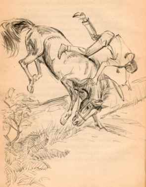 Ginny saw Mr.Dobbs car in front of her house. She did not want Mokey to go back to the horrible farm so she galloped through the woods but missed a log and fell badly on her head.